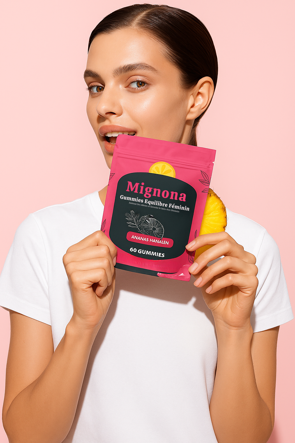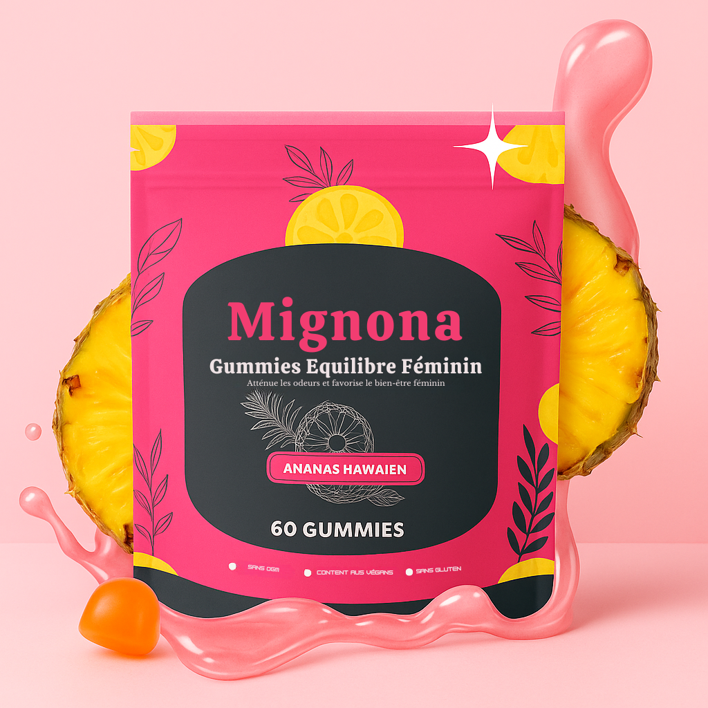 Grâce à une formule naturelle à base de probiotiques et d’extraits de plantes, Mignona aide à neutraliser les odeurs, prévenir les irritations et renforcer la flore vaginale — tout ça avec un délicieux goût d’ananas hawaïen 🍍